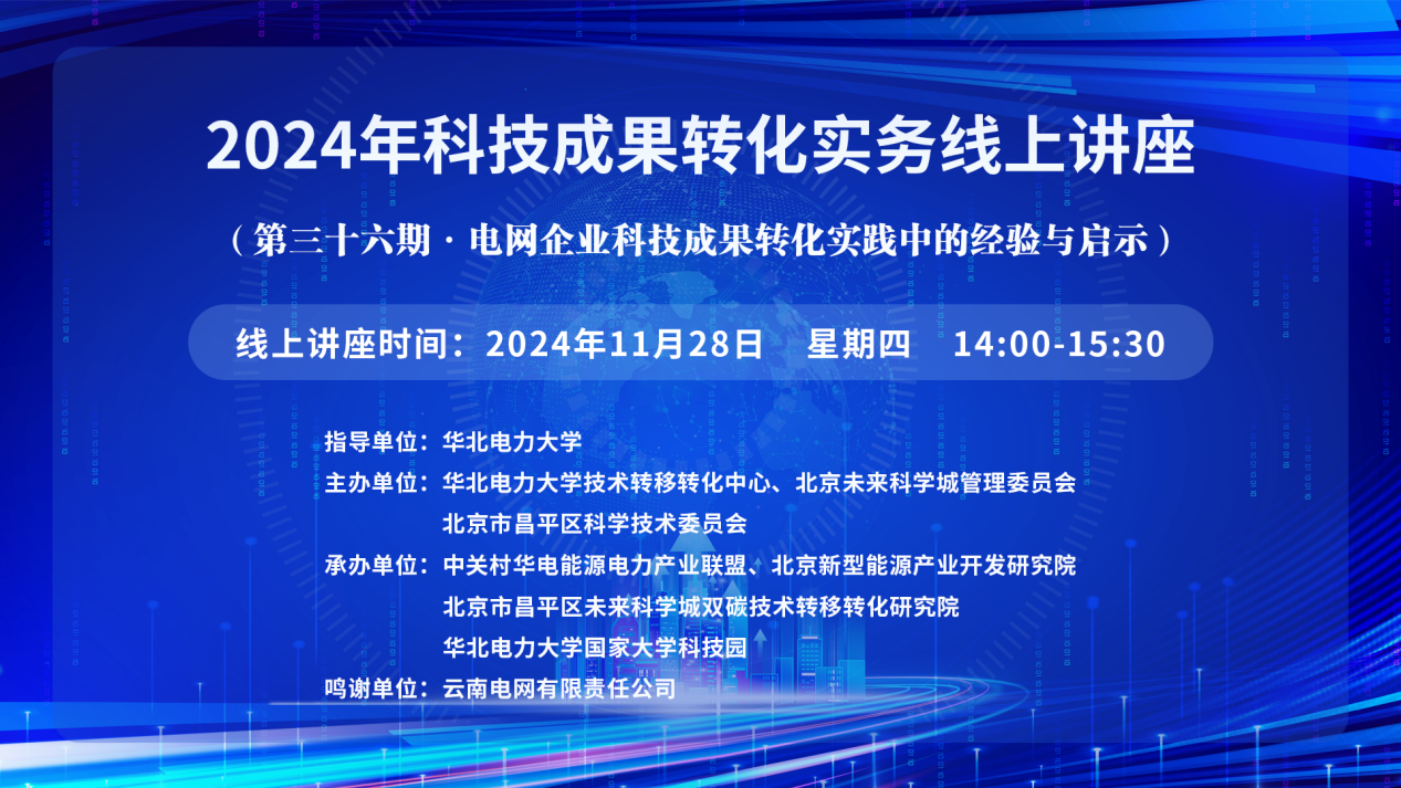 2024年科技成果转化实务线上讲座(第三十六期)【讲座主题】电网企业科技成果转化实践中的经验与启示 【讲座时间】11月28日 【讲座地点】https://wlwth.xetlk.com/sl/xB9xJ 联系人:李晓婉 13311276132 【主讲人】 朱全聪 云南电网有限责任公司电力科学研究院成果转化主管 【主讲人简介】 朱全聪,云南...主讲人:朱全聪时间:2024-11-28 14:00地点:线上讲座 -